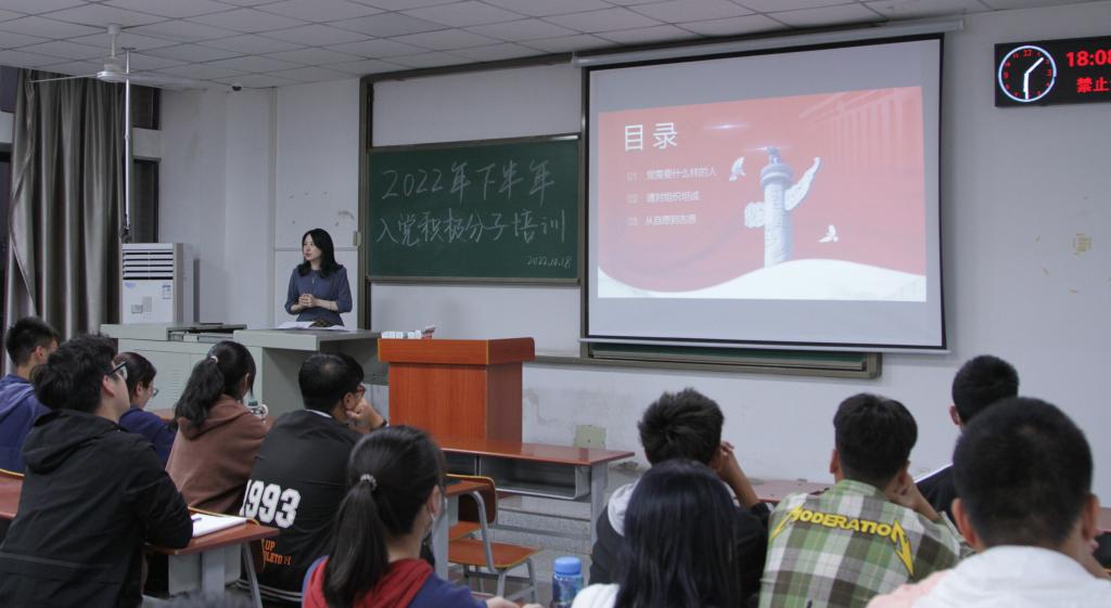 (通讯员 刘昕竹/文 赵臻浩/摄)2022年10月18日晚上6时,太阳成城集团tyc234cc官网在武教A310开展了入党积极分子培训,公司党委副书记刘娥讲授“青春心向党,争做‘党’中人”主题党课,85名入党积极分子参加。