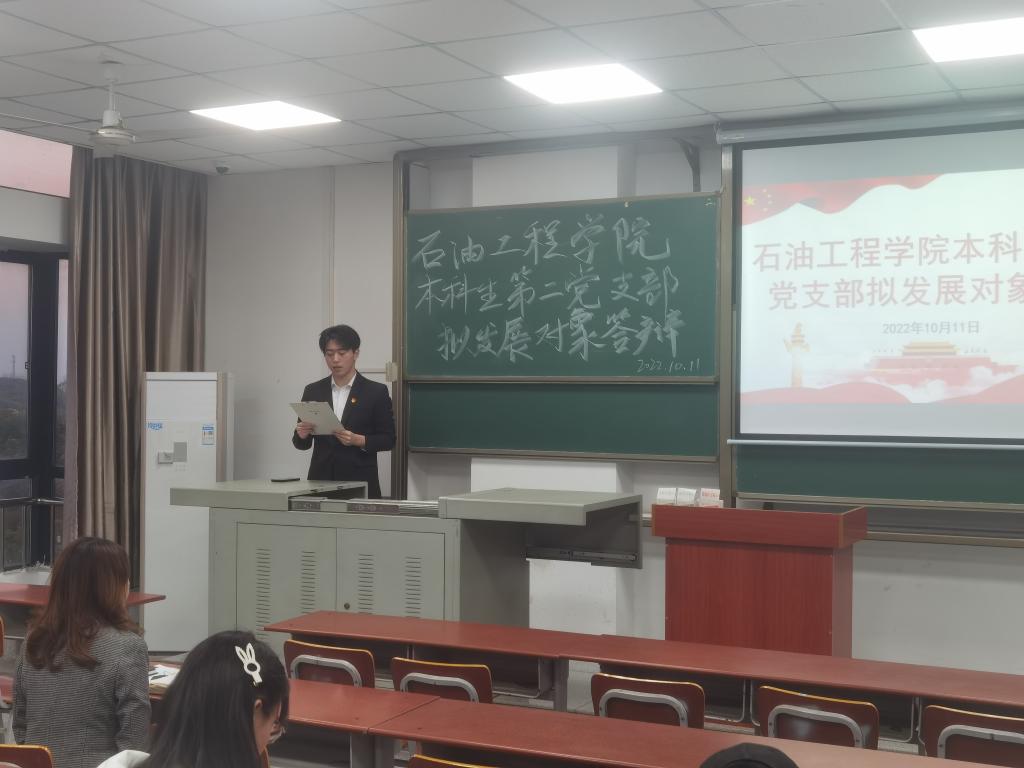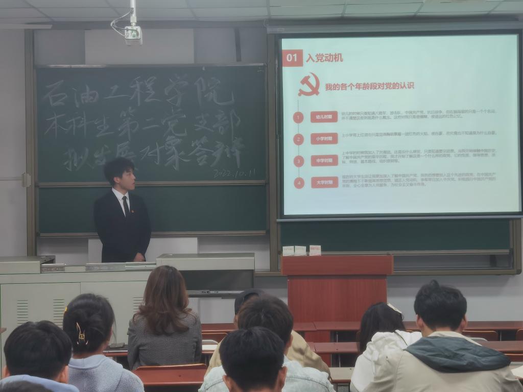 (通讯员 任堂政)2022年10月11日下午六时,太阳成城集团tyc234cc官网本科生第二党支部于B-402召开拟发展对象预审答辩。本次会议由支部任堂政同志主持,党委副书记刘娥老师,支部29名党员,支部16名拟发展对象参会。