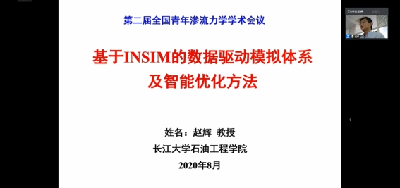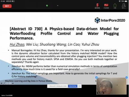8月31日-9月4日,国际多孔介质协会(International Society for Porous Media)第12届全球年会(Interpore 2020)在线上举办。该会议国际多孔介质协会主办,中国石油大学(华东)承办。公司赵辉教授受邀参加会议并担任大会分会场主持人。会上,赵辉教授发表题为“A Physics-based Data-driven Model for Waterflooding Profile Control and Water Plugging Performance”的大会报告,引发与会专家的热烈讨论与好评。近年来,赵辉教授团队的研究成果在智能油气藏领域的影响日益深入,受到了国际同行的高度关注与认可。本届大会上,挪威SINTEF公司Manuel Borregales等人的大会报告中将其创立的数据驱动模拟模型(INSIM)引入到目前世界石油领域著名的开源油藏数值模拟仿真软件MATLAB Reservoir Simulation Toolbox(MRST)中,该软件被国内外广大石油高校和石油公司广泛采用,用于教学、科研和快速原型开发研究。