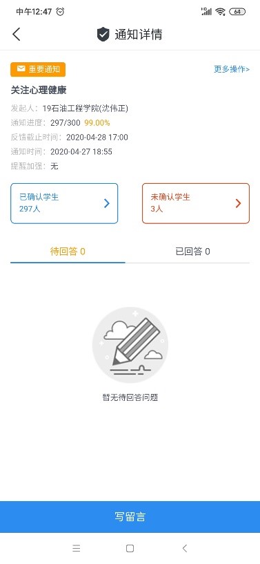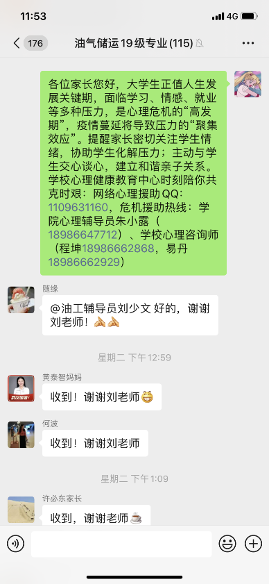 疫情期间,公司推进家校平台的搭建,家校携手保障员工居家安全。各辅导员在家长群、微信公众号平台、各班级群发布《太阳成城集团tyc234cc官网致家长的一封信》,再次提醒家长坚定服从政府在疫情期间的防疫政策,在未得官方通知前,员工不得返校,提醒家长在居家期间要培养良好亲子关系,关注员工身心健康,主动和员工谈心交心,科学理解员工心理情绪,并公开告知家长各年级辅导员联系方式一起公司心理健康教育中心求助方式。公司通过辅导猫以及班级QQ群等形式,对员工开展了心理健康教育工作,鼓励员工科学求助,助力员工在疫情期间化解压力。