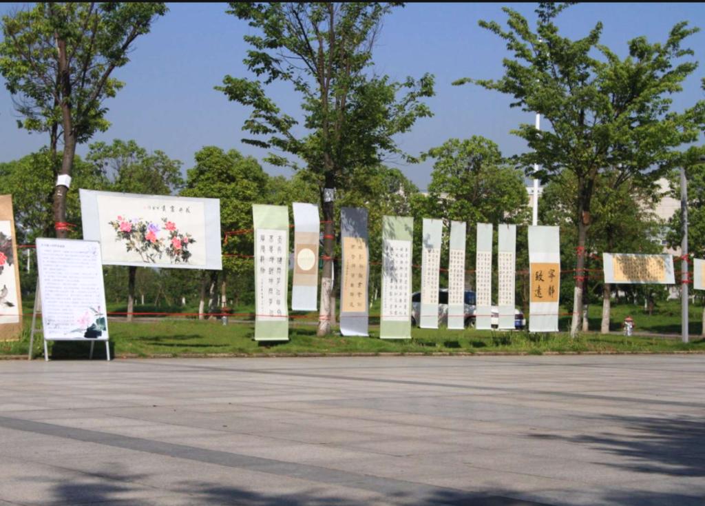本次书画展分为七十春秋国盛强、清风道泰迎曙光、秀美长大涌热潮、同心共逐中国梦等四个部分。每一个部分都包含书法和绘画,形式多样,且内容丰富。作品展中有书法作品——习近平语录“志之所趋,无远弗届,穷山距海,不能限也”、“道不可坐论,德不可空谈”、“回首来路,豪情满怀,不忘初心,砥砺前行”;有楷书临摹《将进酒》;更有八幅取材于武汉校区的写意花鸟画作品;还有来自祁倪军8位书法好友的助展作品。这些作品或书法工整隽秀、挥洒自如;或绘画栩栩如生、笔墨淋漓,引得路过的同学驻足欣赏,更有喜好书法的老师前来欣赏点评。