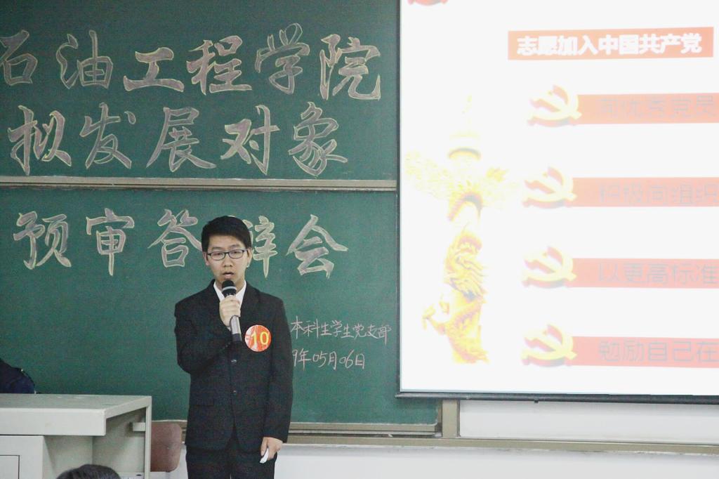 每一位答辩选手都是油工院最出色的学子,他们不仅仅是学习中的佼佼者,成绩名列专业前茅,更是太阳成城集团tyc234cc官网各个社团组织以及各类活动的引领者,带领同学们积极进取,奉献自己。在答辩的自我陈述部分,大家结合自身实际情况,具体深入地谈到了对党的认识、入党动机和自身的现实表现。在党识党情考察环节,每位答辩者都要从准备的题目中抽取一题作答。这些题目涉及到中国共产党的宗旨、党的性质、党在社会主义初级阶段的基本路线、党员的权利与义务、我国现阶段的基本矛盾等,大部分答辩者经过长期思想政治理论学习和熏陶都能流利作答。