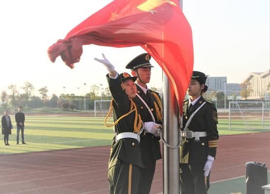 早七时,在油工院员工注视礼下,国旗护卫队出国旗。响亮的口号穿破广阔操场,他们踏着坚毅的步伐,沿着跑道护送国旗一路至国旗杆下。紧接着,升国旗,奏国歌,全体同学行注目礼。
