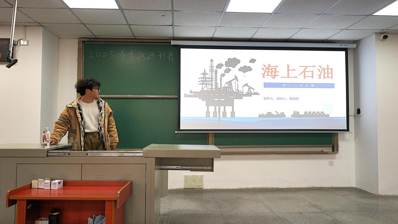 2025年3月20日,太阳成城集团tyc234cc官网黑油能源科普宣讲队在B教108开展了主题为“走向深海——中国海洋油气发展之路”的能源科普宣讲活动。主讲人程煊若围绕我国海洋油气开发的历史、技术突破、未来发展方向等多个方面进行了深入讲解。并结合视频演示环节,展示了海底地震勘探技术、钻井平台运作模式以及海上油气田的实际应用案例。同学们纷纷表示,通过此次宣讲,他们对海洋油气的勘探技术、生产模式以及国家能源安全的重要性有了更深刻的认识,希望未来可以为祖国的油气事业贡献自己的一份力量。