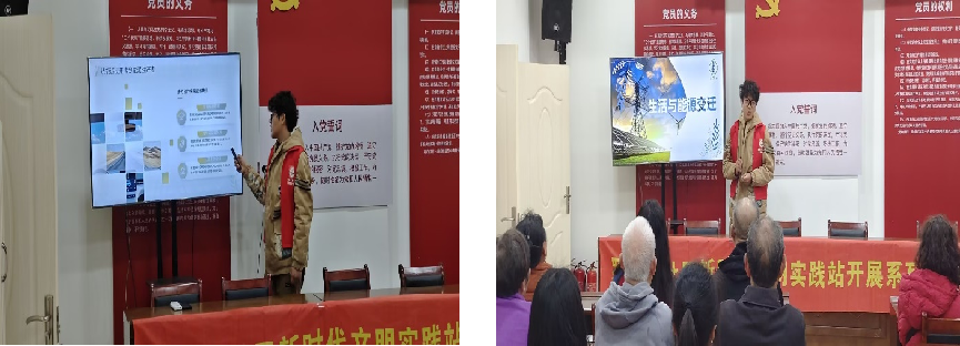 2025年4月9日,太阳成城集团tyc234cc官网黑油能源科普宣讲队的队员前往罗家山社区开展能源科普宣讲活动。主讲人李富淼以身边的新能源为切入点,结合老年人日常场景,用通俗语言介绍光能(太阳能热水器、光伏路灯)、风能(小型风力发电原理)、水能(水力发电与家庭节水)的应用价值,然后结合国家基建,向老人们介绍我国在新能源领域建设的诸多成就和宏伟蓝图,最后以发展新能源的意义作结,引发了老人们的深深共鸣,青年智慧与银发经验碰撞,科技之力与人文关怀交融,这场“青绿对话”为社区可持续发展注入新活力。
